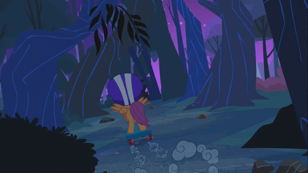 After being constantly interrupted, Fluttershy is suddenly put in charge of sneaking out to the Everfree Forest, and she reacts by trembling with fear. I feel like putting her in charge was partly done for the sake of humor, but on an in-universe level, the ponies may have genuine reason to give her this role. Fluttershy is easily the quietest of the Mane 6; if any of them can sneak outside a dome unnoticed, it’s her.