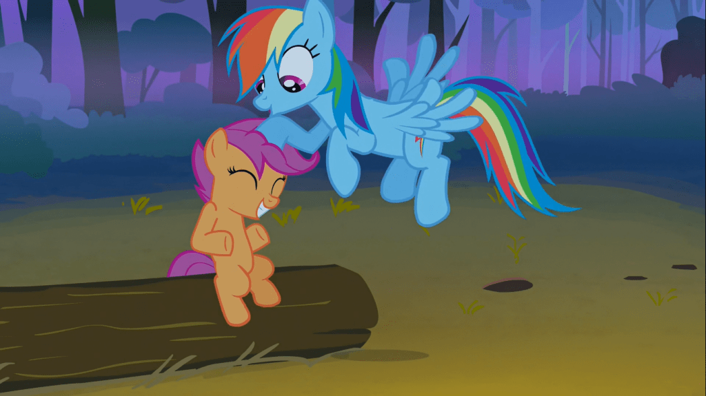 Scootaloo’s extreme interpretation of Rainbow Dash’s three words sounds to me like all her life, she wished she had a big sister, and she considers Rainbow Dash the perfect big sister for her. There are many loose hints at Scootaloo not having much of a family, and they’ve caused fans to jump to conclusions, much like Scootaloo is doing here. Still, it’s pretty heartwarming that since neither of them have any biological siblings, Scootaloo and Rainbow Dash become each other’s siblings—siblings in all ways except genetics.