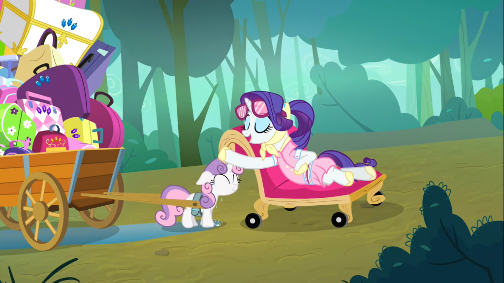 The camping trip goes reasonably well at first, with Rarity packing an absurd amount of luggage and making her little sister carry it. Although she has a comically bad understanding of what camping is supposed to be like, it’s character development to see her willing to participate in such an activity at all. Still, while Rarity’s portrayal shines bright in episodes focused on her, this is another episode where her characterization feels rather flat.
