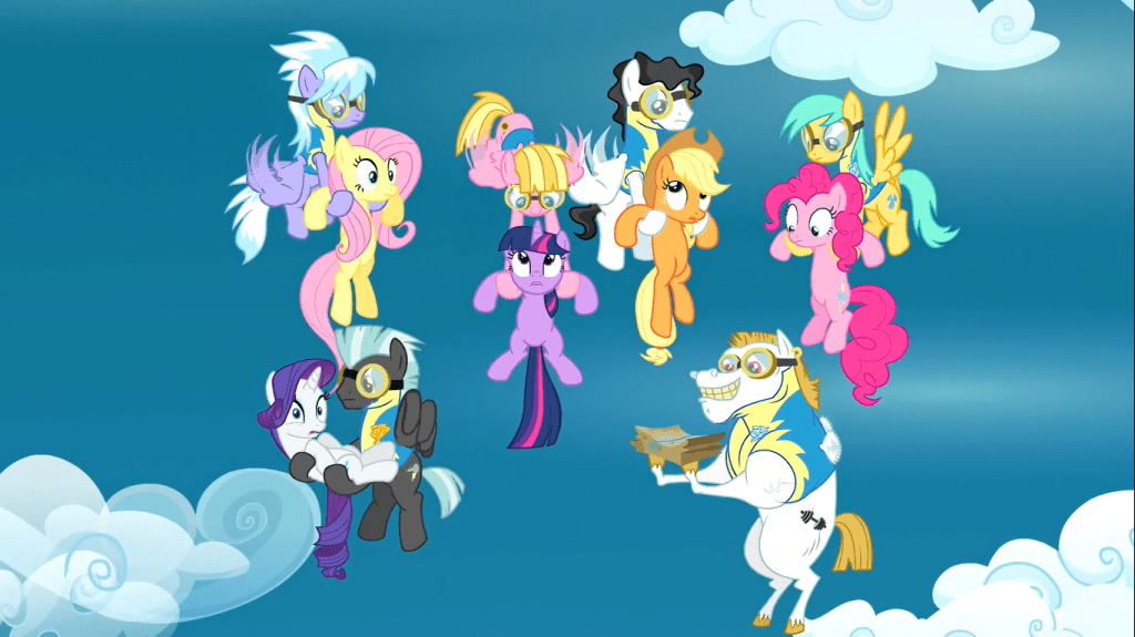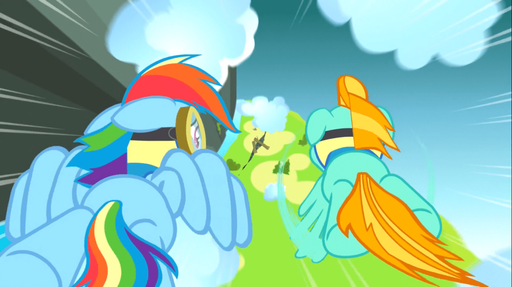 The hot air balloon’s strings break in the tornado, and the ponies in it fall out of it screaming. That’s when Rainbow Dash stops what she’s doing and springs to action, demonstrating not just her strong care for her friends, but also her skills as a team player. The rest of the pegasi in the camp stop what they’re doing and each rescue a member of the Mane 6, while Bulk Biceps rescues the care package; clearly the most effective use of his strength.