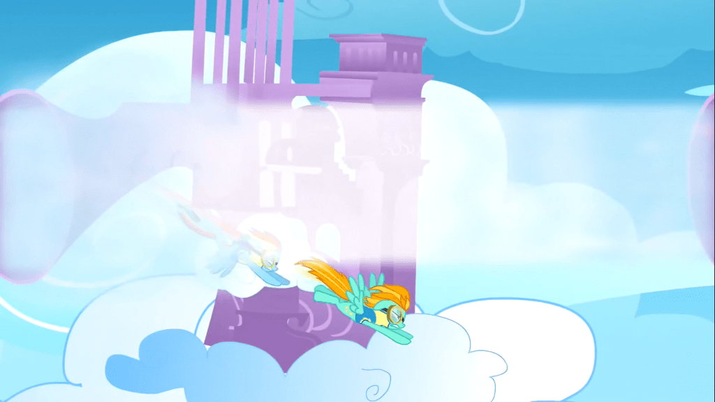 In the next training exercise, the pairs of pegasi are all split into two teams, and each has to collect as many flags as they can. Here’s where Lightning Dust’s tragic flaw becomes clear: she is an extremely talented flyer, but she’s terrible at looking out for others. Rainbow Dash injures her wing on the way to getting one of the flags, but Lightning Dust insists that they keep going anyway.