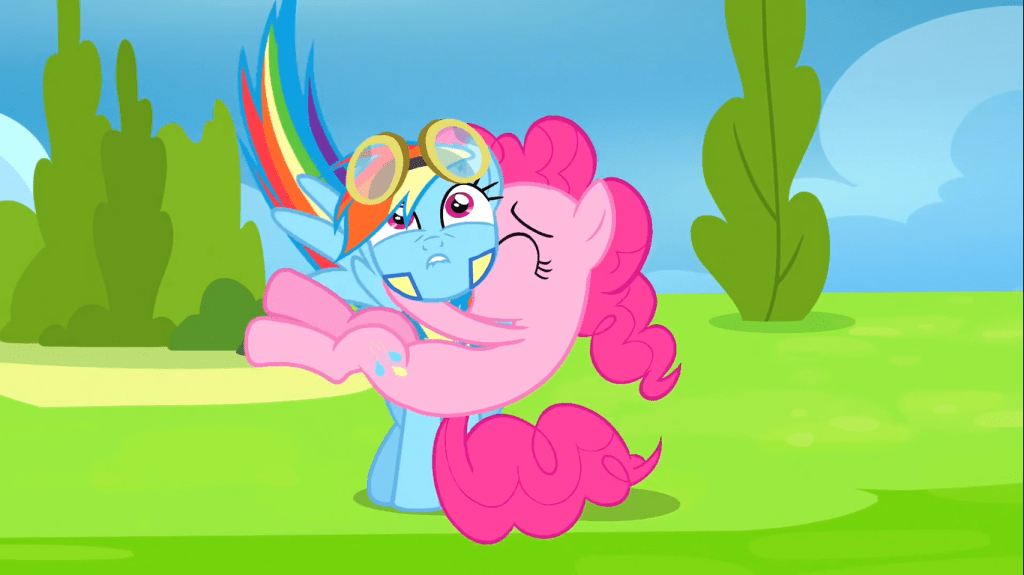 Continuing her exaggerated role, Pinkie Pie gives Rainbow Dash an absurdly tight and long hug, then screams “don’t forget to write” through a megaphone at the top of her lungs. I can’t decide if it’s a better idea to appreciate the gags for what they are or try to gather serious implications about Pinkie Pie’s character.