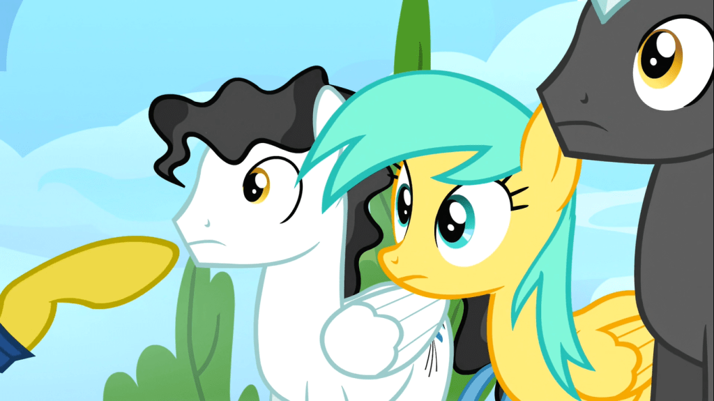 As much as Rainbow Dash likes to show off her skills, I imagine she’s a little put off by Lightning Dust’s last line here—it’s obvious that Rainbow Dash got good at flying through tons of practice and determination. Maybe Lightning Dust really is a natural talent though; a flashback in season 7’s Parental Glideance suggests as much. In any case, Lightning Dust clearly views herself as the big brave hero who’s so much better than everyone else, and Rainbow Dash as her loyal sidekick—perhaps as the Spike to her Twilight Sparkle.* But this relationship ultimately falls apart due to a little something called “Rainbow Dash caring about her friends”.