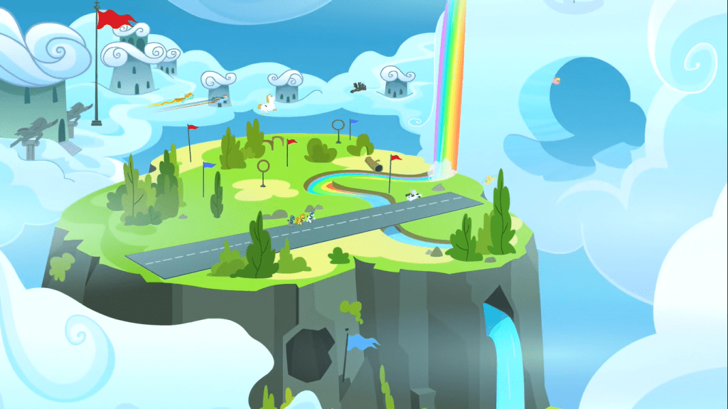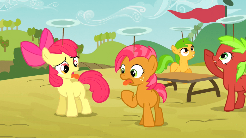 Applejack presents an absurdly long and complicated seven-legged race without a hint of self-awareness, and I have mixed feelings about Apple Bloom’s deadpan “seriously?” It feels like the show knows that Applejack is being ridiculous here, but it doesn’t try to explain why she’s being like this. Did Applejack swap brains with Twilight Sparkle or something? That’s a stupid theory, I know, but it’s the best I can come up with.