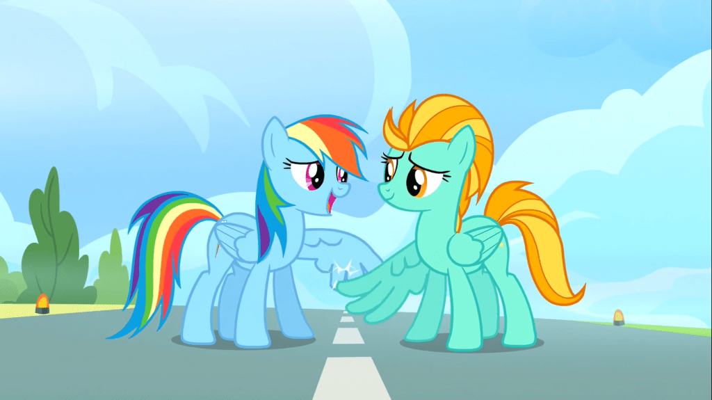 There’s a lot of subtle animation details here that show Rainbow Dash is more hesitant than Lightning Dust.