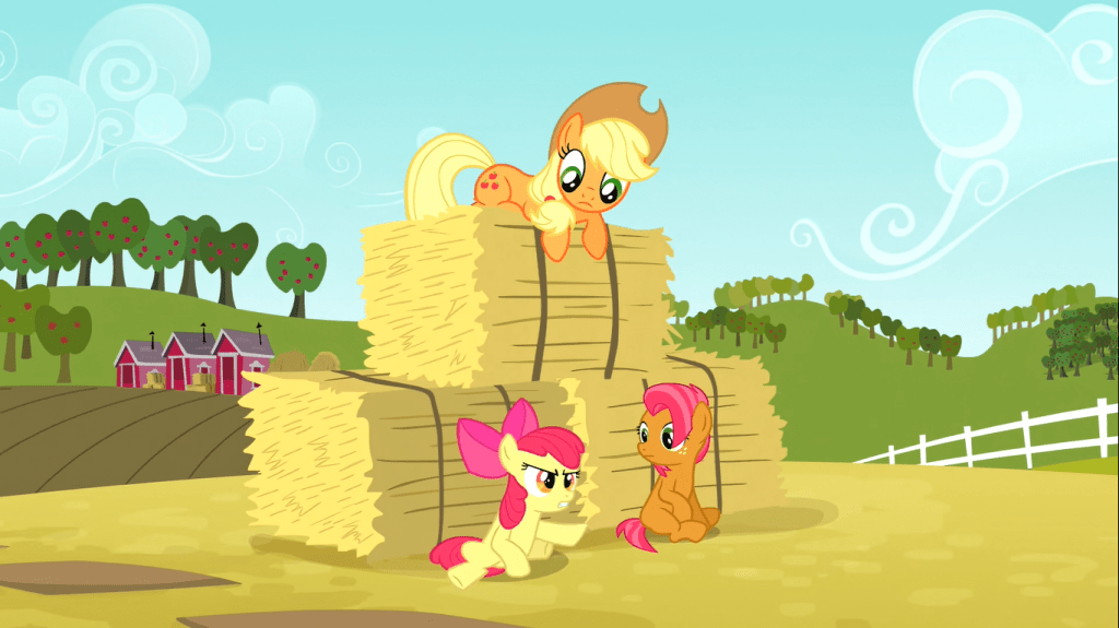Poor Apple Bloom thought Applejack wouldn’t find her if she hid behind a haystack.