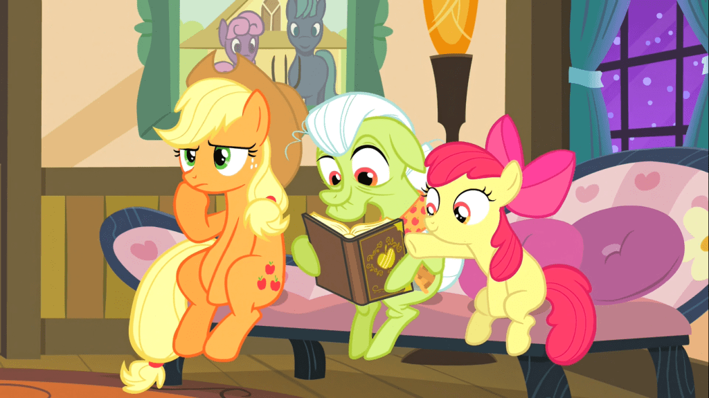 Just as Applejack is pondering what all supplies she’ll need for the reunion as Granny Smith tells stories from the photo album, I’m going to ponder how Applejack’s promise ties in with her element of harmony.