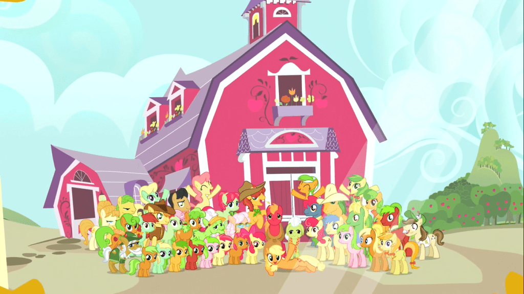 This episode starts with Applejack and her immediate family preparing for their family reunion, which is going to have a ton of relatives this time. The most interesting thing to point out here is probably that Apple Bloom is excited to see Babs Seed again. Babs Seed has a voiced role in two episodes close to each other, but as I said last time we saw her, she’s then shafted for the rest of the show. Maybe forgetting about Babs Seed after a short time is in-character for Apple Bloom though. Her mind flits between different interests in rapid succession, and spending time with her favorite cousin could well qualify as such an interest.