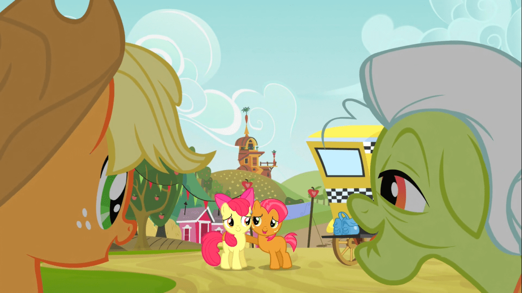 Babs Seed mentions she’s made two new friends who are also blank flanks, and at this point I’m convinced that the fanfic fuel is deliberate. I feel like the hasty, cramped nature of this reunion played a part in Apple Bloom never getting to have a strong friendship with Babs Seed like she does with the other two Cutie Mark Crusaders.