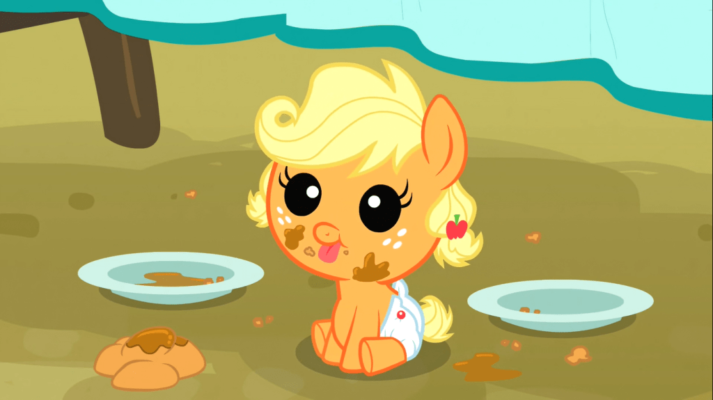 One of the flashbacks ends with showing us baby Applejack. Normally, when a character in a show is shown as a baby, they will exhibit traits classic to that character as best as possible, but the trait baby Applejack demonstrates here is… having the appetite of a full-grown stallion? At least that’s what Granny Smith tells us. Maybe this flashback goes to show that Applejack isn’t the kind of pony who was born with her signature traits, but rather had to learn them through hard work.