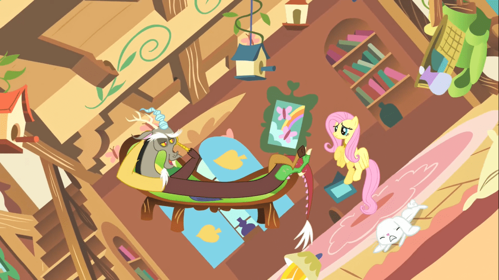 Meanwhile at Fluttershy’s place, Discord has made the house constantly rotate, claiming it’s more comfortable for him, and Fluttershy buys into it. It’s not an unfair assumption on her end; this guy is the Lord of Chaos. He never feels at home when things are plain and straightforward.