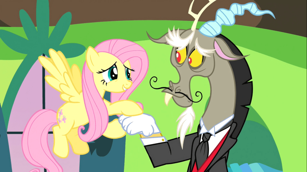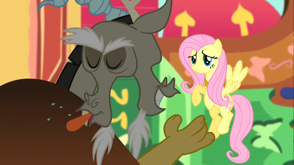 As Discord points out, it’s striking how different Fluttershy treats him from how the rest of the Mane 6 do. Fluttershy treats him with kindness and respect because it’s in her nature to do so, and while it sounds crazy at first, this treatment eventually pays off.