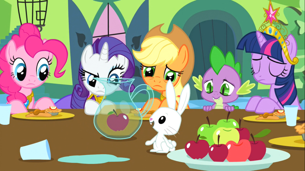 But this heartfelt moment is interrupted when Angel comes in and tries to convey that there is a flood at Sweet Apple Acres, as the rest of the Mane 6 try to guess what he means until they get it right. I’m not sure why Angel doesn’t just communicate it to Fluttershy; maybe he thinks Fluttershy wouldn’t believe him or is too preoccupied with this dinner party? This scene is funny, so I can’t complain too much.