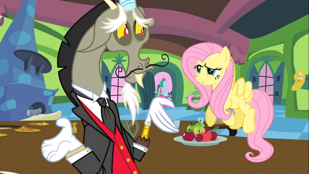 Fluttershy uses The Stare on Discord, and he pretends to be terrified then laughs. Then after a threat from Twilight Sparkle, he turns the animals back but secretly turns other animals evil, leading to a sarcastic “oops”. This sets the stage for Discord’s characterization through the rest of the show: not outright villainous, but still willing to use deft trickery to serve good in obtuse ways.