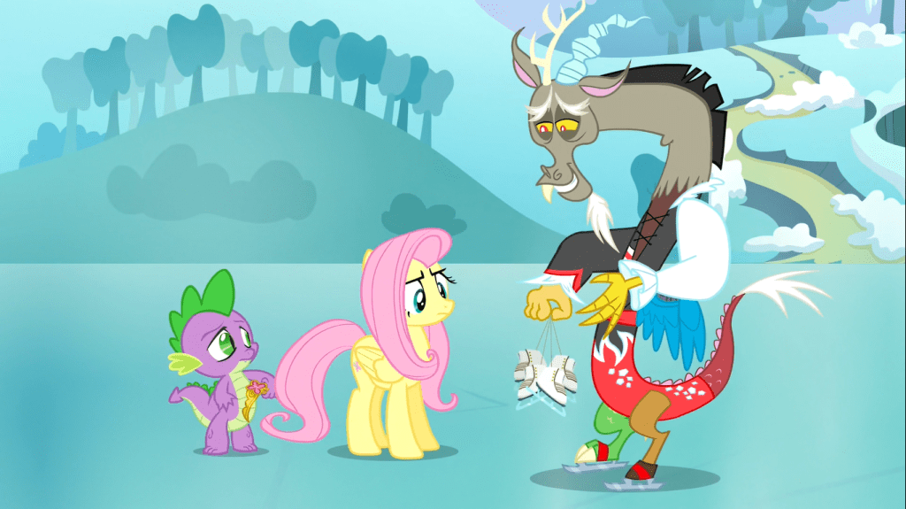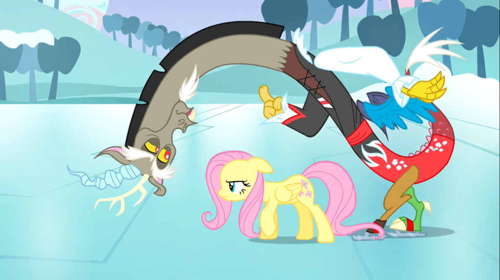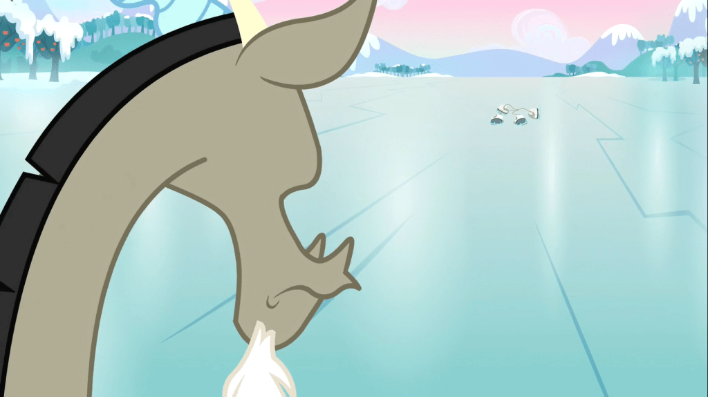 Discord agrees to fix this flood if Fluttershy promises not to use her element of harmony against him. When Fluttershy takes off her butterfly necklace, Discord turns the flood into ice, which doesn’t fix the problem at all. Discord is soon to learn a common theme in this show: these ponies can do amazing things without needing any silly magical objects, which can be summed up as the last three words of this show’s title. He thinks that without the Elements of Harmony (the objects, not the personality traits), there is no way he could ever be reformed, but he’s soon to be proven wrong.