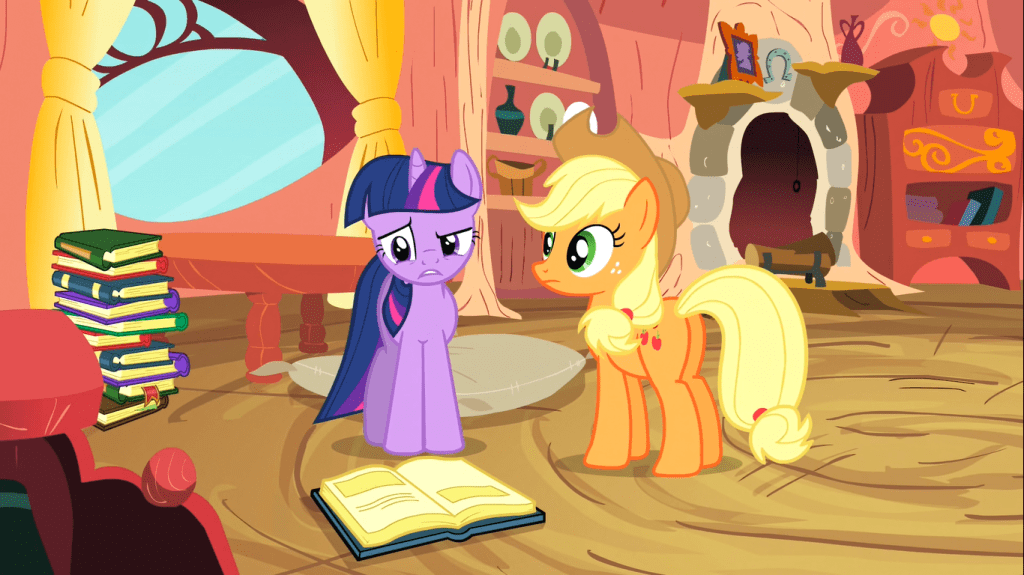 OK, next up is a scene that is too funny for me to be mad at. Twilight Sparkle is so absorbed in her book that she doesn’t notice when Applejack calls her name, but when Applejack nudges one of her cups of ink, that’s when she snaps out of it. Does it make sense? Not really. But does it match with Twilight’s persistently hilarious obsession with detail? Absolutely. It also shows that Applejack knows Twilight Sparkle well, which is lowkey sweet. After getting Twilight’s attention, Applejack tells her what all Spike said to her, and she’s shocked.