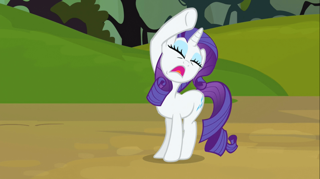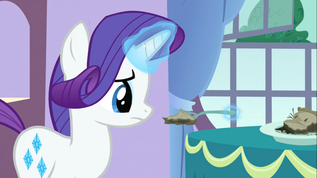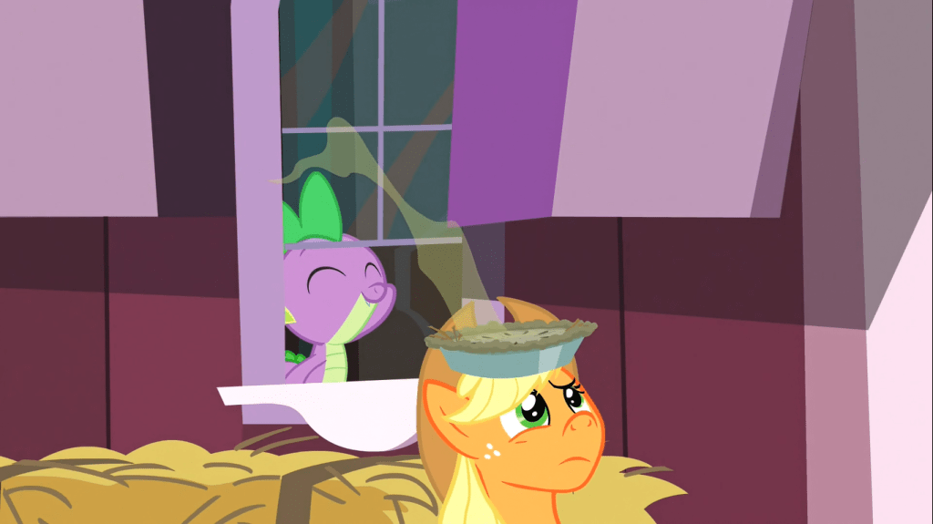 I give up on taking this episode seriously. Spike asks what more he can do and suggests taking the pie* he made to Rarity offhand, Applejack goes “sure, why not”, and Rarity eats a tiny piece and secretly spits it out. Unlike Putting Your Hoof Down, where Fluttershy was the only character who seemed like her regular self, everyone in this episode is their regular selves except Spike. It’s like Spike has been replaced with some watered-down version of himself from an alternate dimension, and he’s probably kidnapped the real Spike.