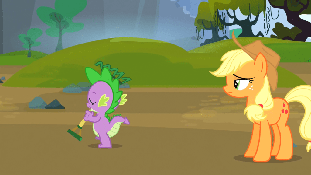 While Spike is kept busy counting the blades of grass at Sweet Apple Acres, the Mane 6 devise a plan to repay Spike’s debt and pretend to have him save Applejack from a Timberwolf. Even though my brain cannot process the Dragon Code as a meaningful part of the show’s lore, it’s at least cool for Twilight to remember the details of it and how to end Spike’s insistence on serving Applejack.