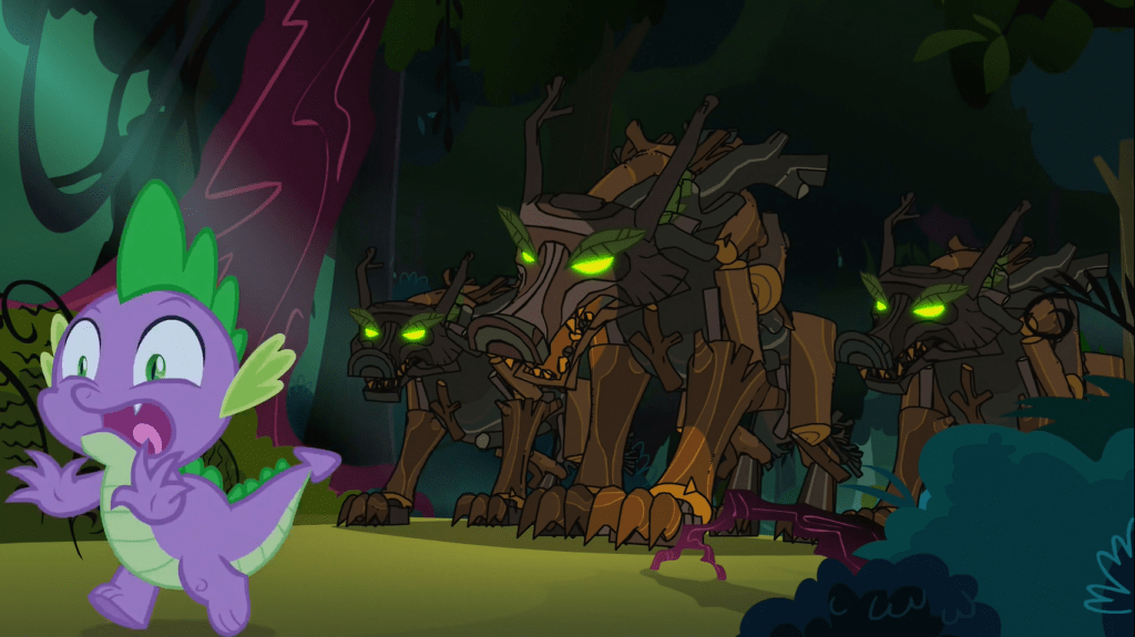 Now, the leadup to the contrivances isn’t so bad. After having exhausted his list, Spike decides to board a hot air balloon and chases after it in a well-animated sequence with some good slapstick humor, grabs onto it, and lands in the Everfree Forest where he’s chased by some Timberwolves, whose animation is done through CGI and thus much more fluid and rich than most of the show. Unlike Putting Your Hoof Down, the episode I had been the harshest on thus far, this episode at least gives us some time of regular good old MLP before it devolves into “uh, what?” territory.