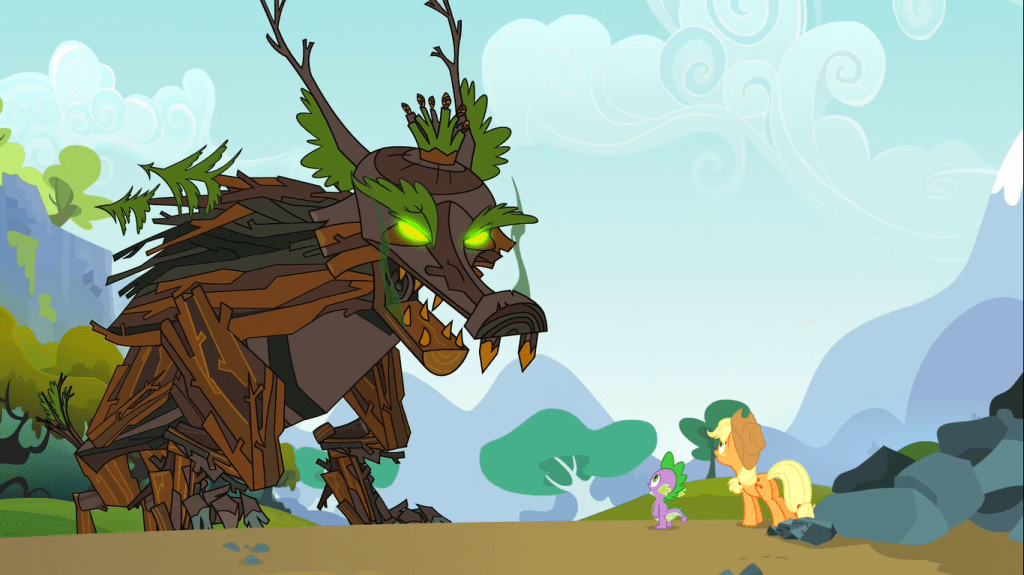 Spike proves that the Timberwolf is fake by noting that a real Timberwolf’s breath has an unmistakable smell, which is a perfect point to lead to real Timberwolves. Applejack defeats them at first, but then they all regenerate into one huge Timberwolf, and Applejack has her hoof stuck between two rocks for real this time. The fake scenario the Mane 6 tried to put on has become reality. Luckily, Spike saves Applejack quickly enough by throwing a pebble in a critical location, namely the Timberwolf’s throat, then using a stick to pry the rocks off. After that, the Timberwolf collapses into a pile of sticks, rocks, and leaves.