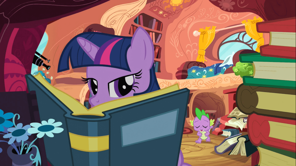- I find it a little amusing that Twilight Sparkle’s stack of books at the start is exactly twelve, as Spike says. Perhaps this show’s staff knew fans would tear the opening scene to pieces if the number wasn’t consistent. (This would be a lot funnier if I hadn’t just torn the entire rest of the episode to pieces.)