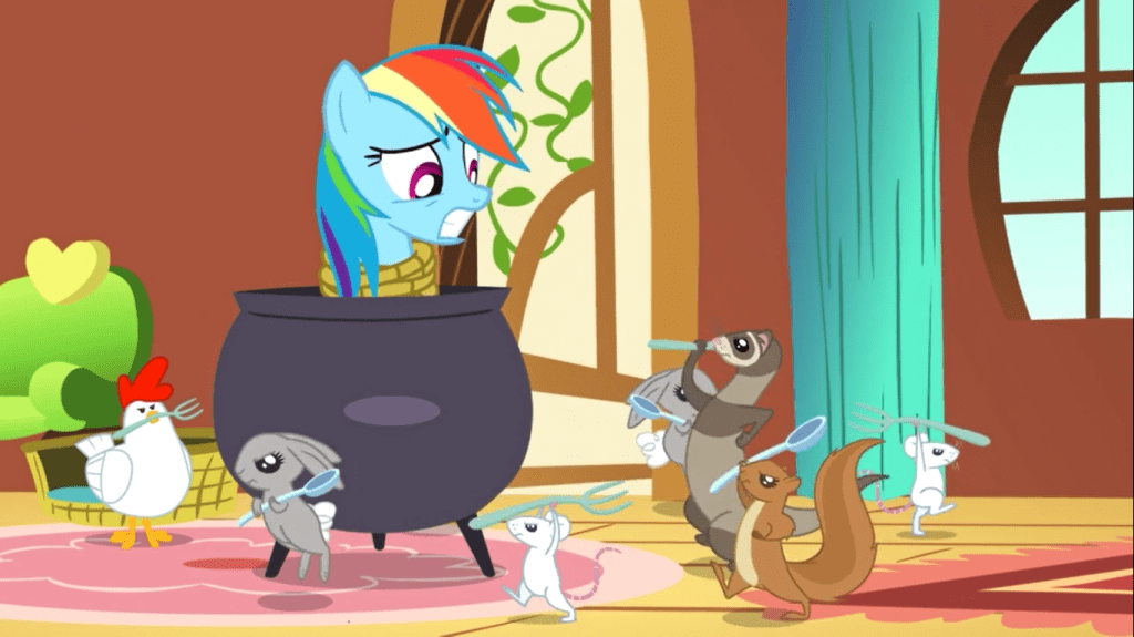 Rainbow Dash has somehow been tangled up and trapped in a pot by a bunch of animals who apparently want to eat her alive. This is a dire situation, and Fluttershy reasonably suggests another way to fix it.