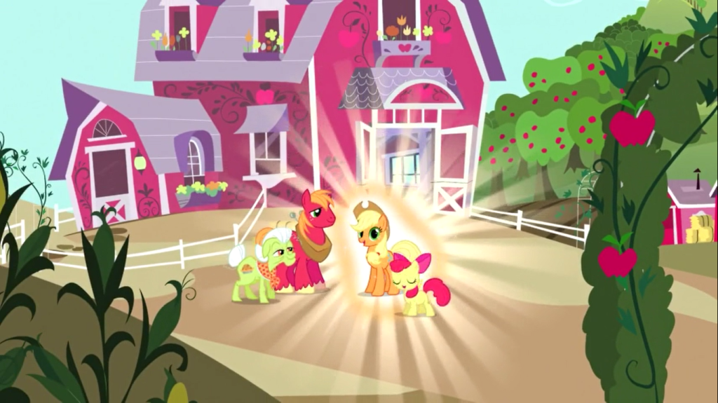 Hey wait a minute, it looks like Big Macintosh, Granny Smith, and Apple Bloom exist after all! They all help Applejack restore Sweet Apple Acres to its former glory at astounding speeds, which is at least more realistic than Pinkie Pie destroying the place because we have four ponies working on it instead of one.