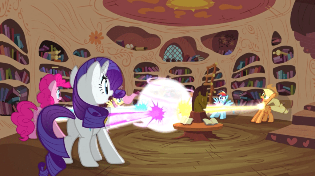 Twilight Sparkle snaps out of her despair soon when she realizes… dun dun dun… the power of FRIENDSHIP! Restoring her friends’ memories and using the Elements of Harmony to remind them of who they really are… where have we seen that before??? Maybe I’m being harsh, but this part of the episode feels like such a rehash of The Return of Harmony, only without Discord.