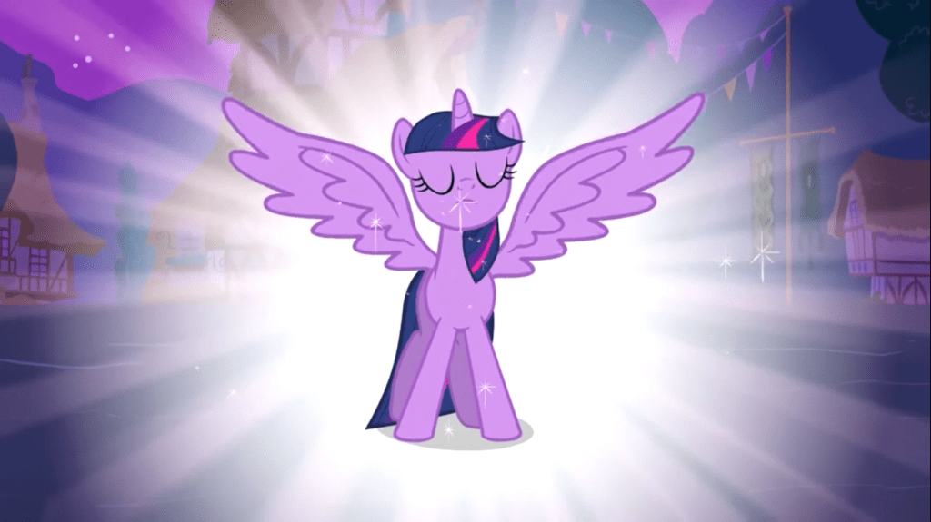 At the end of the musical number, a spark of magic twirls around Twilight Sparkle, and she lets out a huge explosion as she returns to the regular world no longer as a unicorn, but as an alicorn. You probably already know that this change was highly controversial among fans, and I feel it’s only right to go on a big wall of text about Twilight Sparkle having wings.