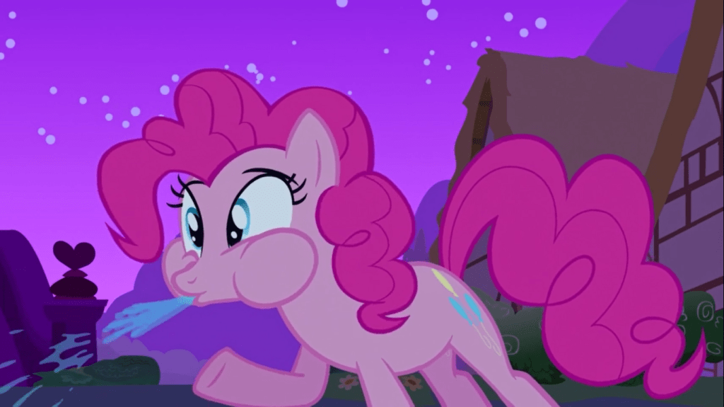 Pinkie Pie knows on a narrative level that a spit take would be the perfect way to react to Twilight Sparkle being a princess, but since she doesn’t have any water in her mouth, she pulls a glass of water out of thin air, drinks it, and then spits it out. I’m sure that with her reality-bending powers, she would be able to conjure water to appear straight in her mouth, but perhaps she chose to conjure a glass of water to make her powers seem slightly less extreme. But I can see right through this act. I know that Pinkie Pie is the most powerful character in this entire show; it’s just that she’s so spacey and goofy that she doesn’t use her powers to wreak havoc.