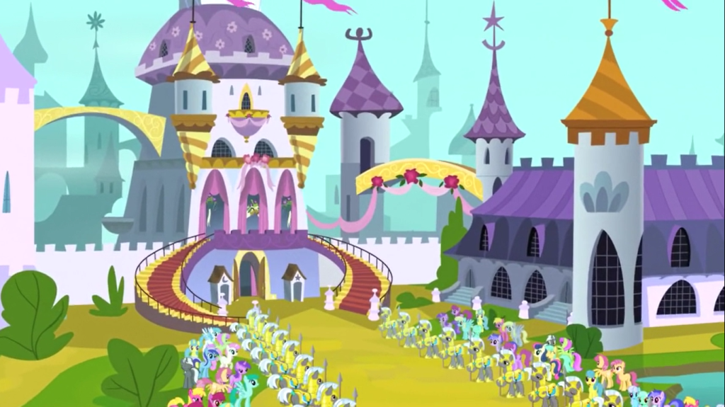And so begins Twilight Sparkle’s—er, Princess Twilight Sparkle’s coronation ceremony. It starts with a speech from Celestia, then as the new princess walks in, we get the sixth musical number: “Behold, Princess Twilight Sparkle”. I feel like I need to analyze something about this scene… so how about the contrast between the diverse guests in the audience and the identical-looking royal guards and singers? Over the show’s first three seasons, the background cast has gotten more and more diverse, with an increasing portion of unique custom designs and less copy-pasting of existing ones. A few particularly popular background ponies, like Lyra and Bon Bon, even have some deliberate appearances. On the other hand, Canterlot’s royal guards are still portrayed as crowds of identical stallions, maybe to symbolize the unity of the group or something? I hesitate to say it’s out of laziness, because something feels natural about all those royal guards looking the same. As for the singers, I’m not sure why they all look like the same palette swap of Fluttershy, but they at least match with the quartet of identical royal guards.