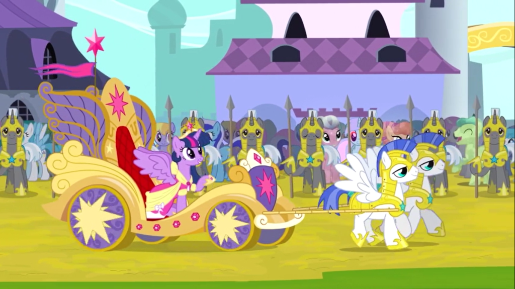 Anyway, the last song in this episode is called “Life in Equestria”, and it’s a triumphant reprise of Morning in Ponyville without any interruptions. Twilight Sparkle rides in a carriage reminiscent of the one she and Spike rode to Ponyville in the first episode, but this time far more grandiose, which is a nice way to go full circle.
