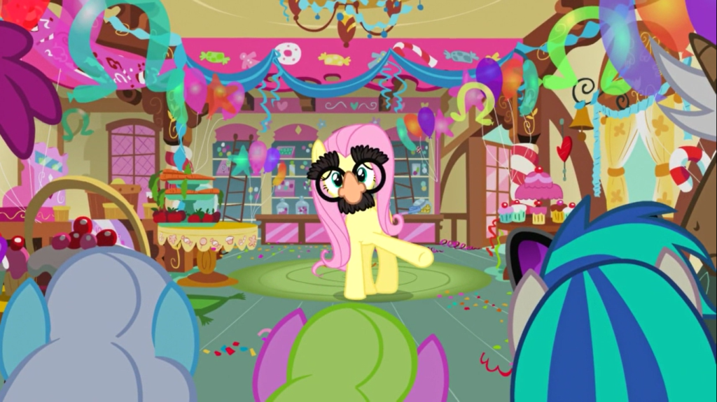 Fluttershy’s section of this song is even weirder to me. She tries to entertain an audience of ponies at Sugarcube Corner, but for some reason, everyone there finds her extremely unfunny. None of them laugh when she puts on beagle puss glasses, but they burst out laughing when Spike puts on the very same disguise and does a little dance. It’s weird because even though Fluttershy is mostly known for being kind and soft-spoken, her gentle mannerisms cause plenty of great humor—the “yay” scene in Sonic Rainboom is one such example. And she does have a snarky side; not as much as Twilight Sparkle or Rainbow Dash, but she can be snooty when she wants to be. This scene weirdly tries to convey that Fluttershy simply isn’t a very funny pony, which isn’t true. Personally, I find the dissonance between Fluttershy’s personality and the atmosphere of Sugarcube Corner very amusing; as I said before, this whole cutie mark swap would make great humor if it wasn’t so fast-paced.