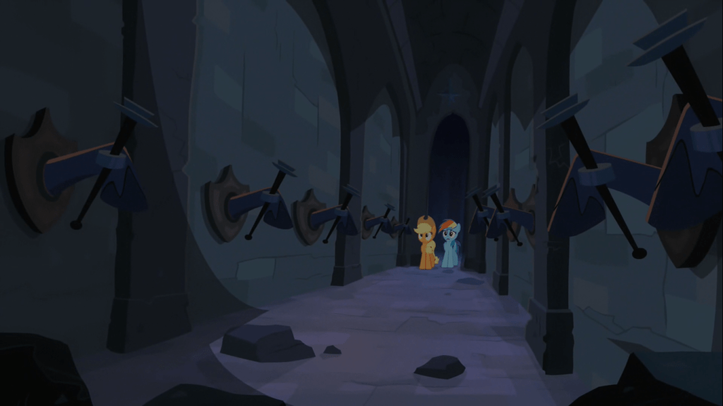 Applejack and Rainbow Dash go downstairs and enter a hallway of disembodied hooves while continuing to deny their fears. In amazingly hypocritical fashion, Rainbow Dash says that if Applejack is scared, she can just admit it. This demonstrates how both of them are not just scared of the castle, but scared to admit they’re scared.