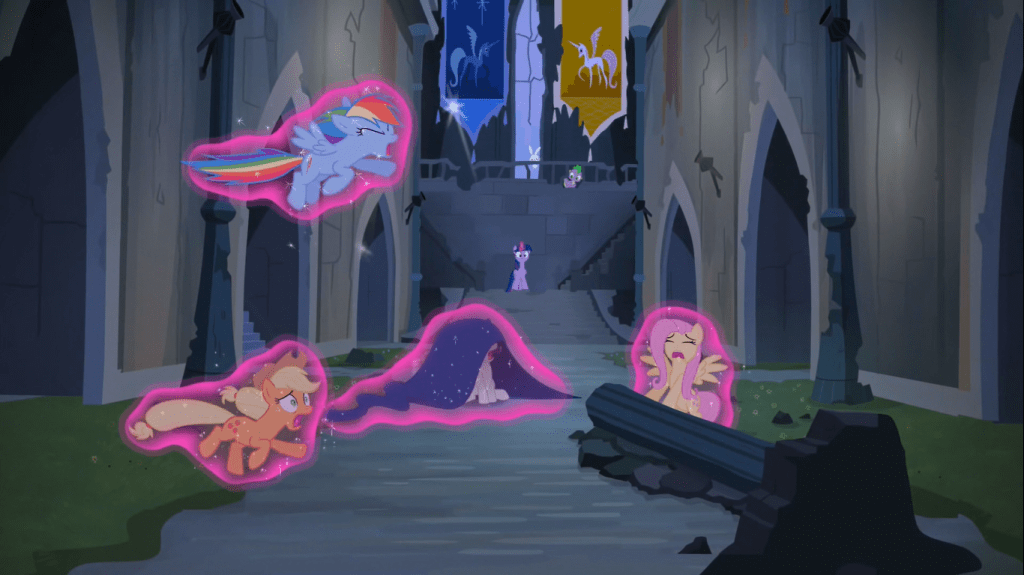 Not shown: guards in the fortress trying to stop the Mane 6, with one almost stabbing Applejack with a spear.