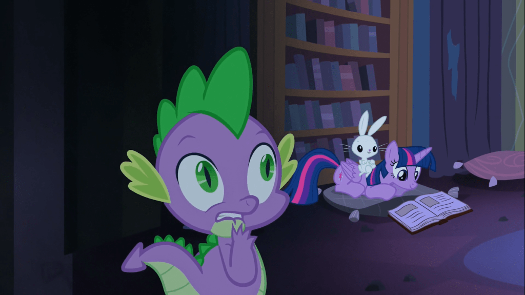 Twilight Sparkle is too absorbed in her book to notice the organ music or the sound of her friends screaming. It’s easy to see why Spike is so scared of this; he’s always feared the possibility of Twilight leaving him behind, or being too wrapped up in her own matters to save her friends. This reminds me of the scene in Spike at Your Service where Twilight is too absorbed in her books to pay attention to what Applejack tells her, and that scene suddenly seems a lot less nonsensical in retrospect.