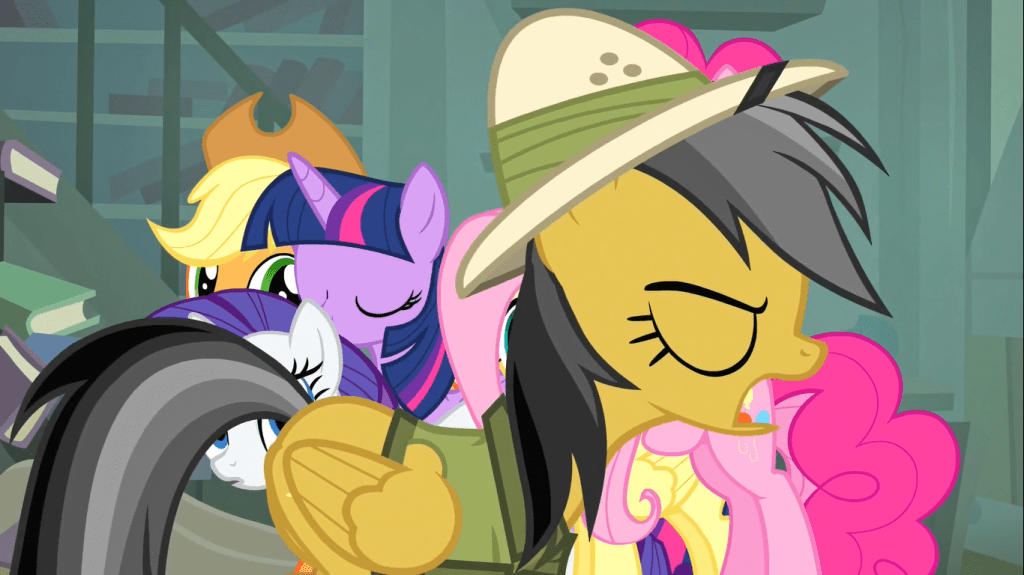 I love Twilight Sparkle and Rainbow Dash’s contrasting remarks on the reveal of Daring Do’s identity. Twilight Sparkle represents fans of a work of media who earnestly let their minds be blown and enjoy the experience as it’s handed to them. Rainbow Dash, on the other hand, tries to play it cool and act like she’s ahead of the game and knows every detail, even when she doesn’t. I’ve been in both sides aplenty, though in the past few years I think I’ve probably been more like Twilight Sparkle. This is especially true with when I watched seasons 5 through 9 of this show for the first time; I enjoyed the ride all the way through without letting petty complaints get the best of me.