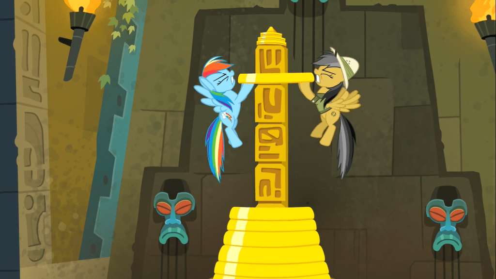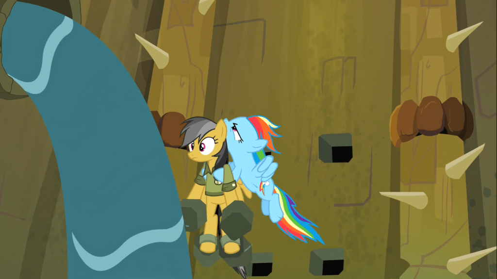 As Daring Do tries to escape from her clutches and almost falls into the rising water, Rainbow Dash arrives and rescues her at the last minute, then gives Daring Do her hat. Although Daring Do insists yet again that she works alone, her facial expressions show that she’s gradually starting to realize the value of friendship. On top of that, since Rainbow Dash was barely able to lift Daring Do up with the blocks weighing her hooves down, Daring Do might not have been able to escape on her own. As Daring Do keeps getting away with her exploits, the villains step up their game, so it makes sense that she’s at a point where she can no longer handle problems alone.