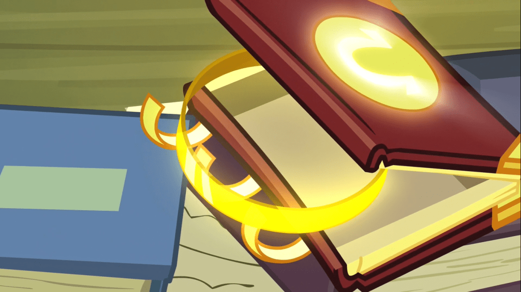 What good is a reveal in any work of media without some foreshadowing and buildup? Before the Mane 6 know that A.K. Yearling is Daring Do, we see the author dig through her bookshelf and open a secret case that contains one of her prized artifacts, cleverly disguised as an ordinary book. She opens the case by solving a little puzzle on the rings that appear to hold the “book” together, which causes the horseshoe icon to glow, allowing her to open it. This looks an awful lot like something Daring Do would do, doesn’t it? This scene is meant to raise viewers’ eyebrows, dropping a hint leading to the reveal that’s soon to follow. If a reveal is dropped on viewers without any hints, the reaction is less of “oh, the hints add up!” and more of “where did THAT come from?!”
