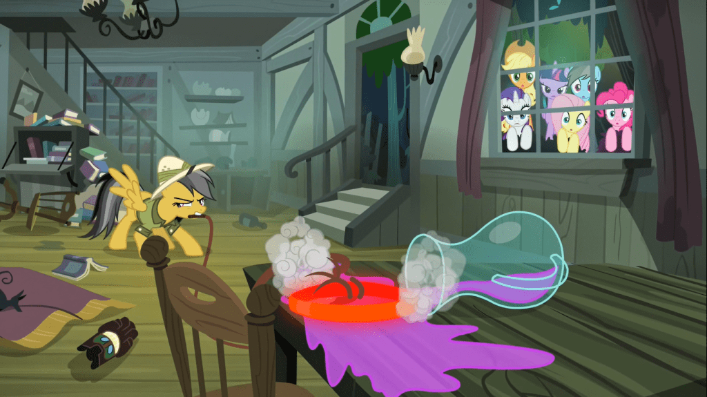 After another Daring Do villain, namely Dr. Caballeron, is introduced, the Mane 6 notice Daring Do has been injured and come inside upon Fluttershy’s suggestion.