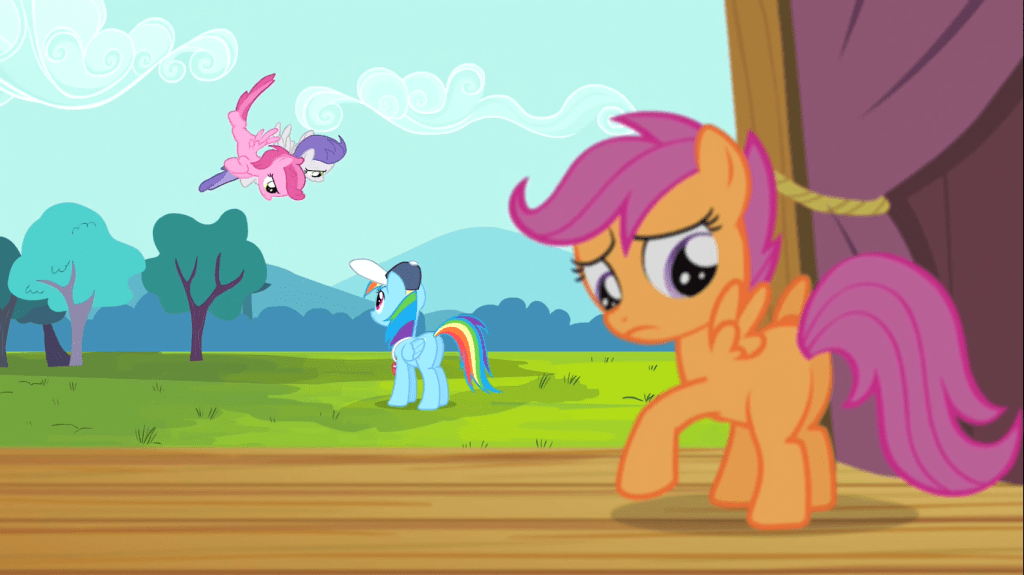 The next morning, the Crusaders show their revised routine to Rainbow Dash. While Apple Bloom and Sweetie Belle are exhausted and disgruntled with these changes, Scootaloo is as awake and eager as ever because she’s just that desperate to impress Rainbow Dash and/or one-up Diamond Tiara. Continuing her attempts at staying professional, Rainbow Dash says that she liked the old routine better. Apple Bloom and Sweetie Belle tell Scootaloo that she’s now made the show entirely about her, which is quite tragic. Scootaloo so badly wants to fly, and she keeps trying to convince herself it’s possible to learn flight within such a narrow timespan. It’s more upsetting the more you think about it.