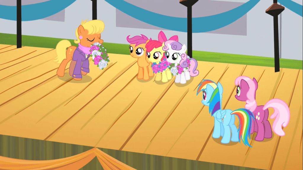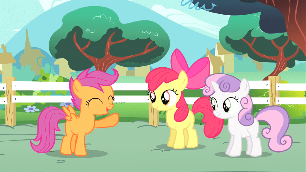 The Cutie Mark Crusaders brainstorm their opening routine, which is supposed to focus on what they love about Ponyville. Since their group has one pegasus, unicorn, and earth pony each, they decide it would be a good idea to represent how different types of ponies come together in Ponyville. Now, there is plenty of logic to this: Ponyville contrasts against how places like Canterlot are dominated by unicorns, or how Cloudsdale is habitable only to pegasi. This isn’t meant as a criticism of anything; just a brief appreciation of how the show’s locations have developed and become more distinct from each other through its course.