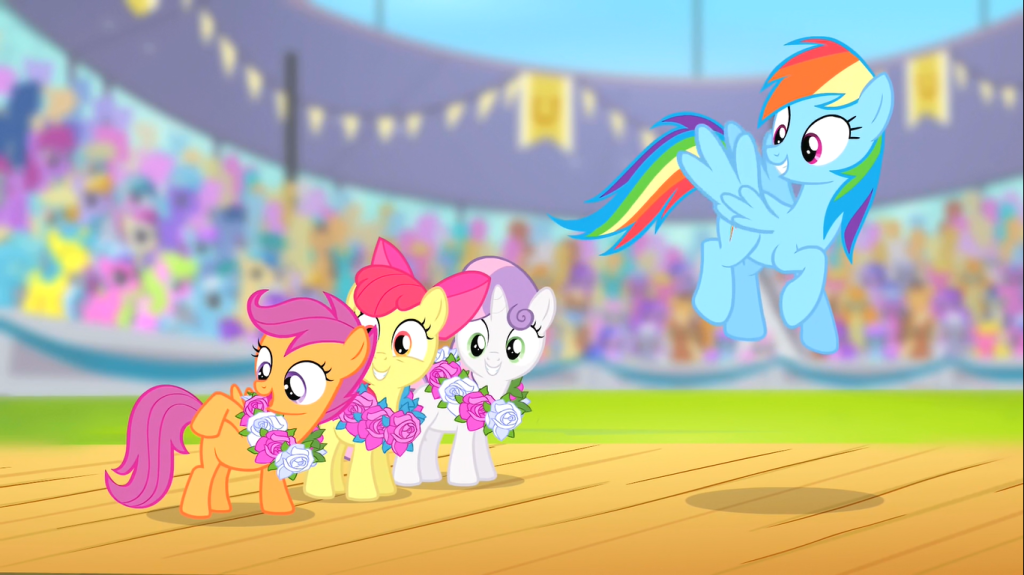 The Cutie Mark Crusaders show Rainbow Dash their flag routine. Diamond Tiara and Silver Spoon watch from behind the bushes, expecting it to be a hilarious trainwreck. But it turns out a big success, with Scootaloo flying her scooter through a trampoline and leading them to celebrate Ponyville together with the group pose shown above.