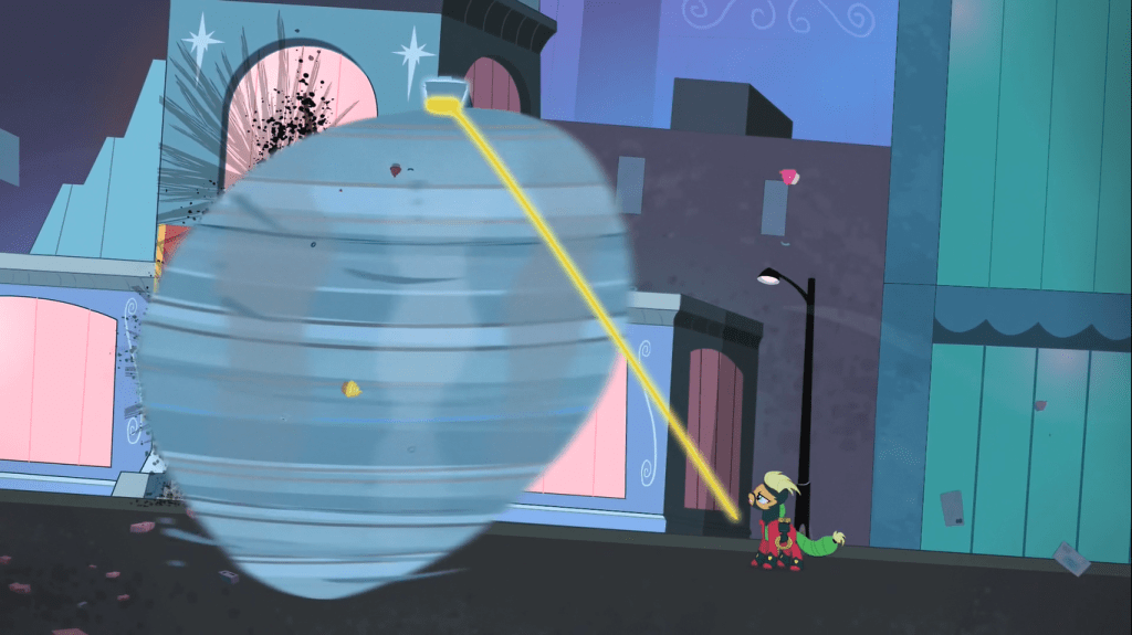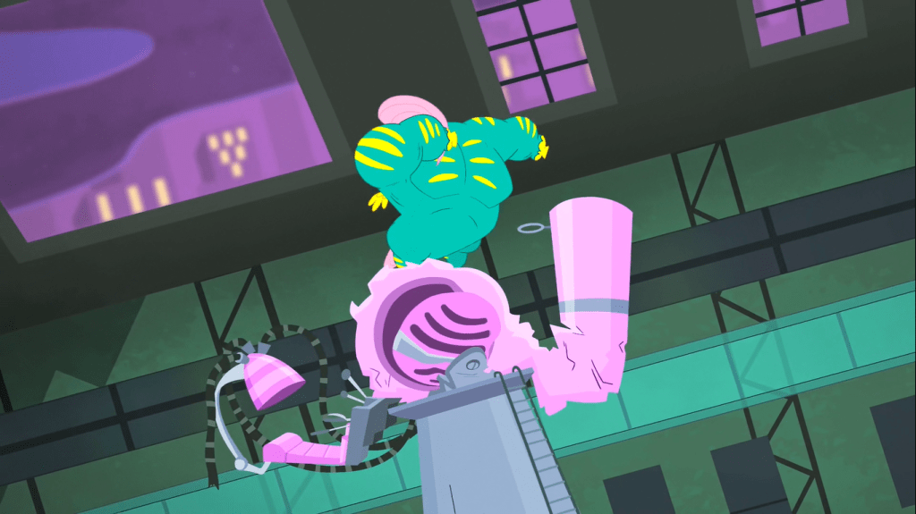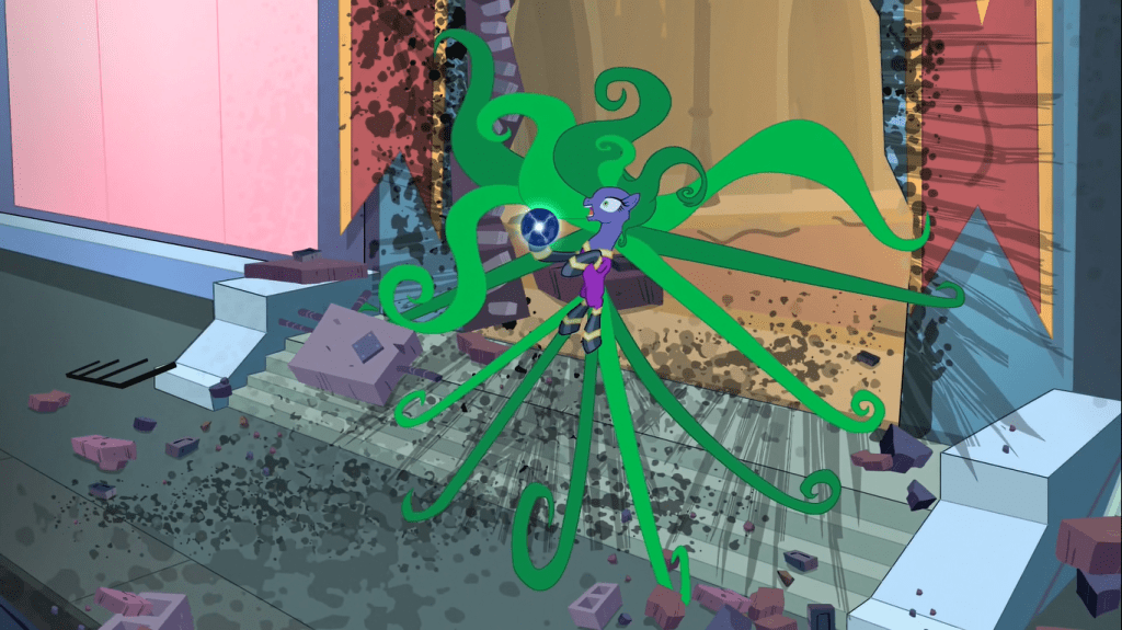 But as a Power Pony, Fluttershy defeats others less through intimidating them and more through sheer brutality. The Mane-iac fires a beam right at Fluttershy, but her mass deflects it and instead hits the villain on the face. She destroys the hairspray ray with her rage until the anger dies down and she taps her hooves together while remaining muscular. Even though this is a Spike episode above all else, Fluttershy has a little arc in it too, where we’re reminded of how she goes HARD with her powers, but only ever uses them in extreme circumstances. There’s probably a narrative trope this could be matched up with.