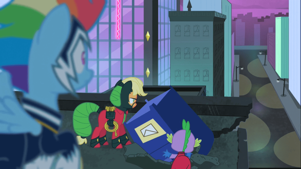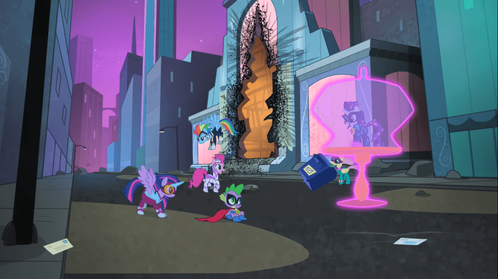 Spike recognizes Maretropolis (Mare-tropolis?), the location of the Power Ponies comics, and sees the Mane 6 each playing the roles of the books’ six superheroes. Each Mane 6 member has a superhero correspond with their powers in clearly intentional ways, whereas Spike corresponds with Humdrum through sheer lack of special powers. I view these superhero roles as an amplified version of how the Mane 6 each already have something that could be construed as a superpower. Fluttershy can communicate with animals, Rainbow Dash has her lightning speed, Twilight Sparkle and Rarity have magic,* Applejack has her lasso tricks and tough hooves, and Pinkie Pie is Pinkie Pie. As for Spike… he can breathe fire, at least, but not much else. In these superhero roles, the Mane 6 each have far more fanciful powers, whereas Spike has none. Typically, lack of a superpower is compensated by wit or leadership skills, and Spike is going to demonstrate the former when the time comes. Though there’s not really indication that Humdrum can’t breathe fire, probably? But even if he could, he probably never has a reason to because of the Power Ponies’ abilities.
