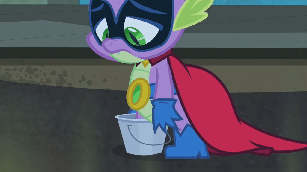 Do you know what it’s like to relate to a character in a bad way and feel like you share their annoying flaws? That’s how Spike feels about Humdrum. Spike getting his claws stuck in a bucket and struggling to get it off is extremely funny in itself, but it’s hard not to feel bad for him, which draws some tension against this slapstick humor. This episode feels like the show is using its obligatory “superhero episode” to try to redeem a common criticism with Spike: he’s the brunt of humor far too often and doesn’t get to do cool stuff of his own much. But by quelling this criticism, this episode fuels another: that Spike only gets to be useful when everyone else is powered down. I already discussed this when I reviewed The Crystal Empire, but I’ll probably discuss it further in the episode’s climax.