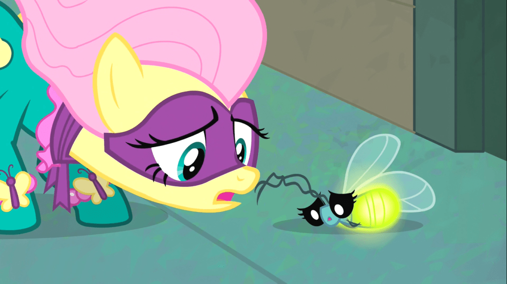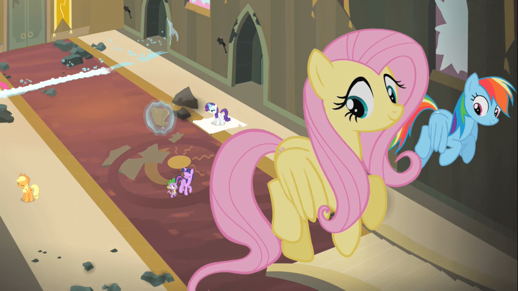 Now that Spike has had his moment of heroism, the Mane 6 can go back to being cool heroes who wallop the bad guys with all their wacky powers while Spike watches, this time not in gloom but in pride. But there’s one who still hasn’t used her power, namely Fluttershy.