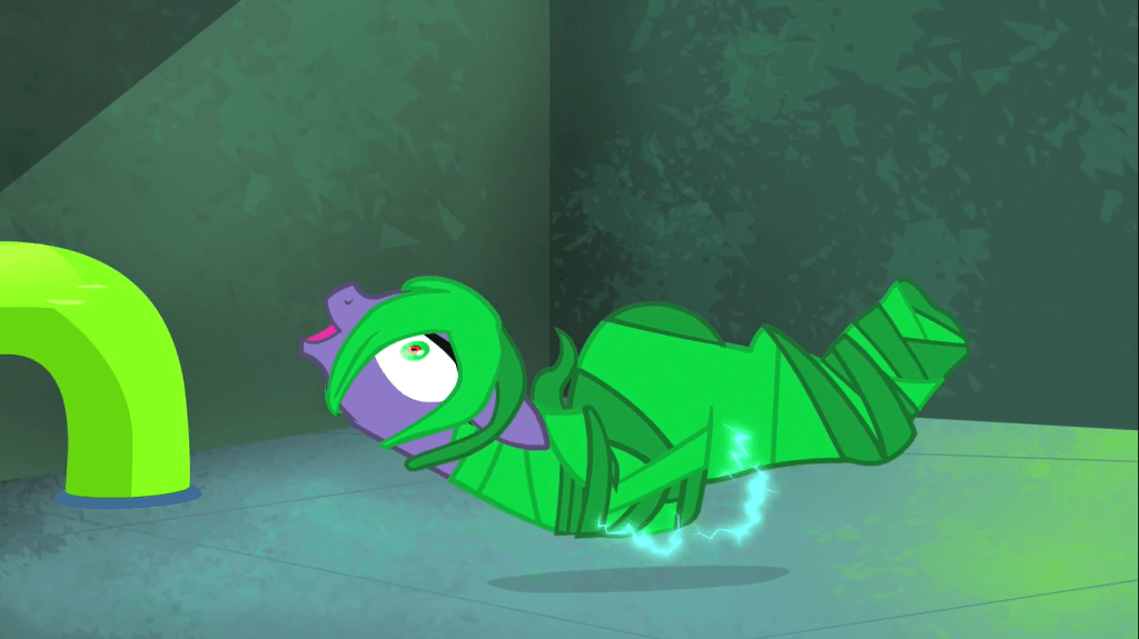 The Mane-iac thinking Spike/Humdrum is useless is the only reason it’s possible to defeat her. It’s hard not to think about how Spike only gets his time to shine here when his friends’ powers have been disabled, as though the story is specifically making way for him to save the day. Her statement that Spike is useless doesn’t make him unlock superpowers within him and reveal he has powers after all. Instead, the situation has been dropped down to be within the constraints of his abilities.