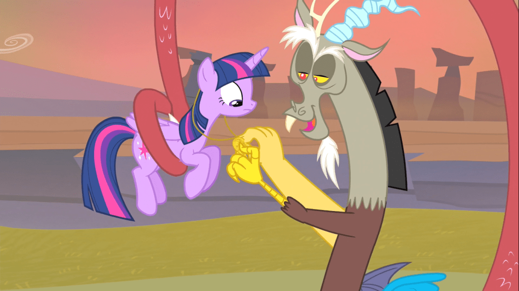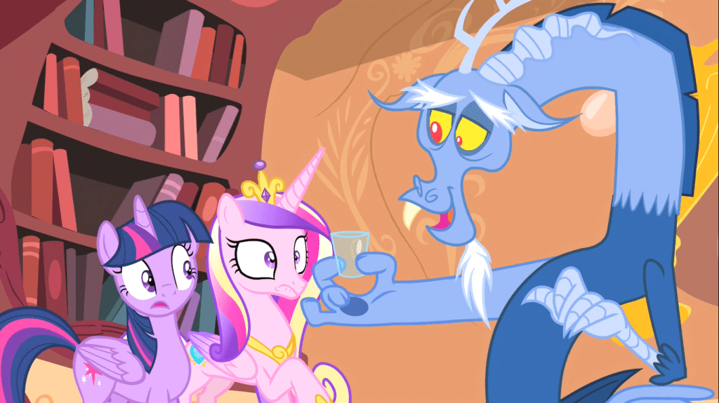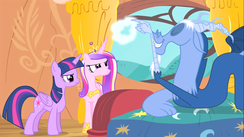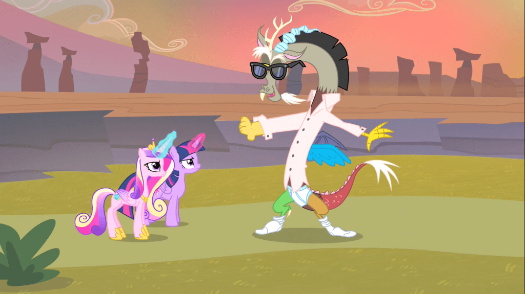 As the main cast of MLP matures, we start learning about how things are from their authority figures’ point of view, and Cadance is a good early example. It turns out that beneath her polite demeanor and princessy tasks, there’s an adventurer inside her just like the Mane 6, and she’s gotten to demonstrate that side of her. Whether he intended to test Twilight and Cadance’s friendship or not, Discord clearly considers it his duty to add some surprises and uncertainty in life—add some discord, if you will. And he succeeded more than he thought he did…