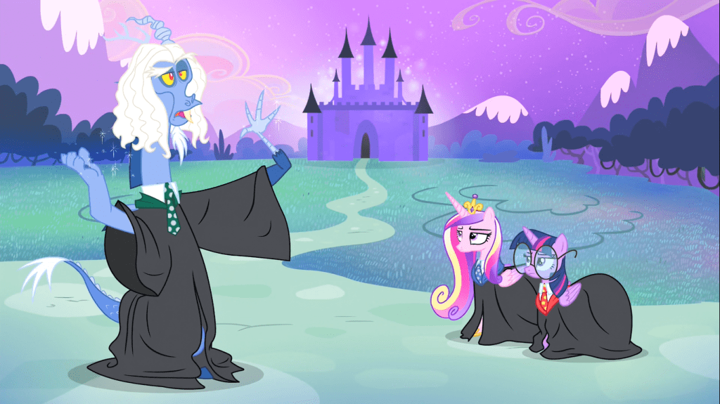 The song is filled with bizarre big lipped alligator moments taking place at a variety of locations with a variety of gags, even including a Harry Potter reference as shown above. The whole song goes to show how heavily Discord is derailing the princesses’ original plans, because he feels it is more interesting and fulfilling for them to go on a crazy adventure with uncertainties than to simply have a relaxing time going “ooh” and “aah” while staring at Star Swirl artifacts.